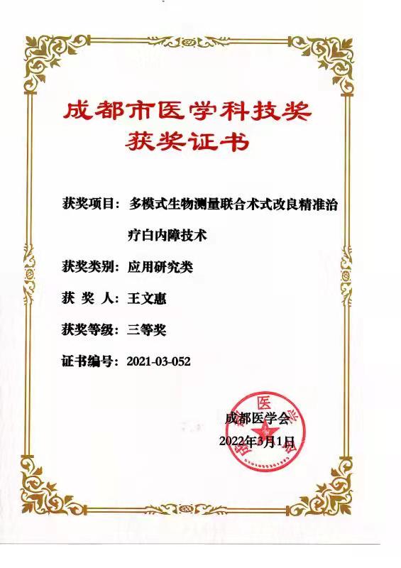 2022年1月,成都医学会公布《关于公布2021年度成都市医学科技奖获奖项目的通知》(成医会字〔2022〕1号),成都爱尔眼科医院白内障科《多模式生物测量联合术式改良精准治疗白内障技术》项目荣获成都市医学科技奖(应用研究类)三等奖。该奖项彰显了我院白内障科10余年来在科、教、研方面的综合实力。