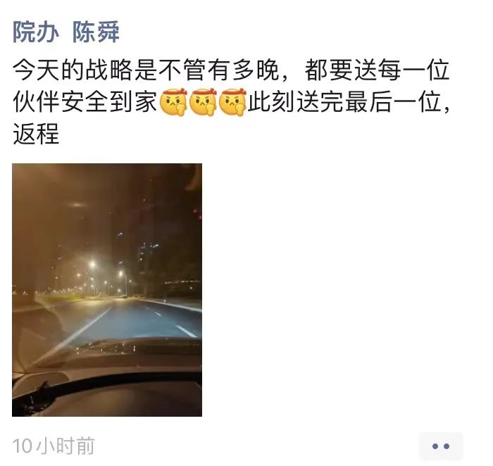 由于核酸检测时间结束多是凌晨深夜,在孙丰源院长号召下,后勤保障职工积极报名组建院内志愿车队,3日凌晨由院办主管陈舜和财务季宏主任、主管王莉书记,为奋战在防控一线的大白提供“深夜摆渡人”安全归家护送服务。